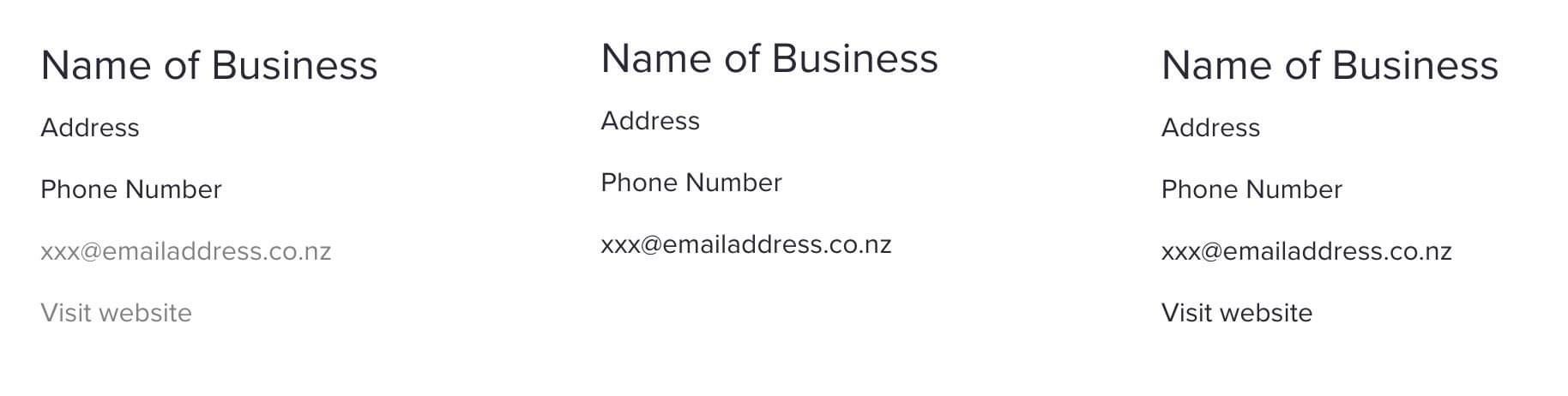 Business name, address, phone number, email address